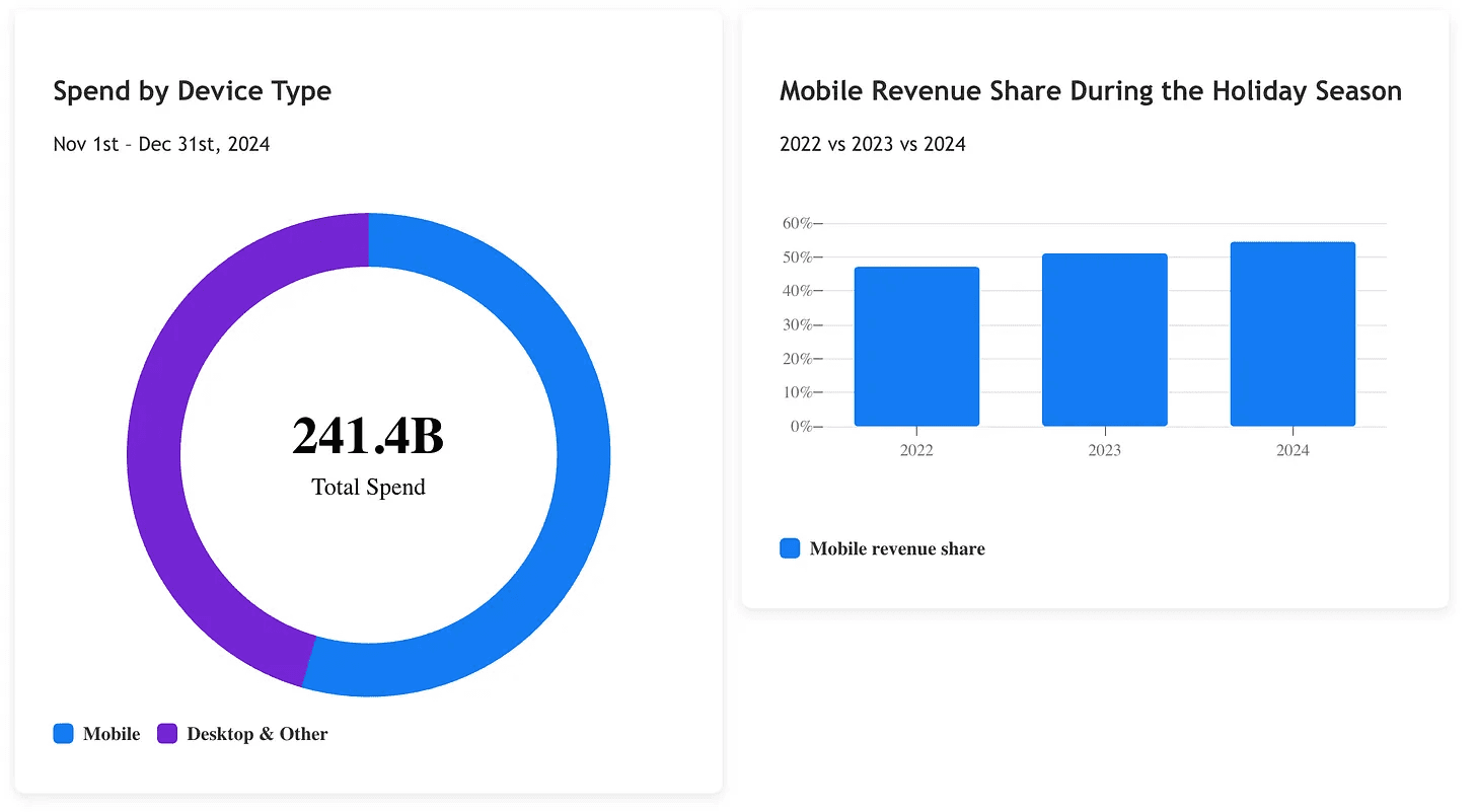 In the US, mobile accounts for 54.5% of all online shopping, reaching peak of 65% on Christmas Day. However it’s worth mentioning that conversion rates are higher on desktop.