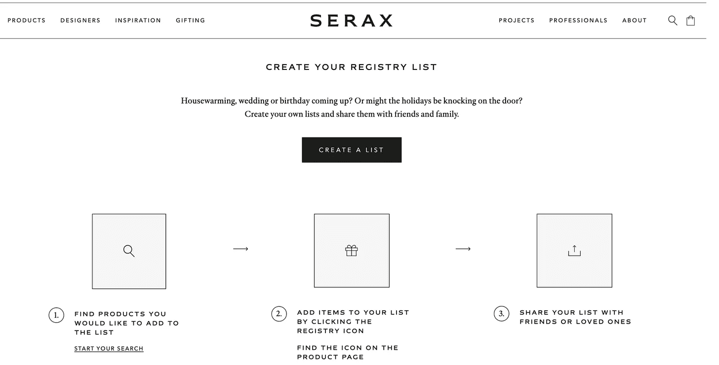 Serax has build supporting functions for gift giving: registry lists, gift guides for different budgets, and life events.
