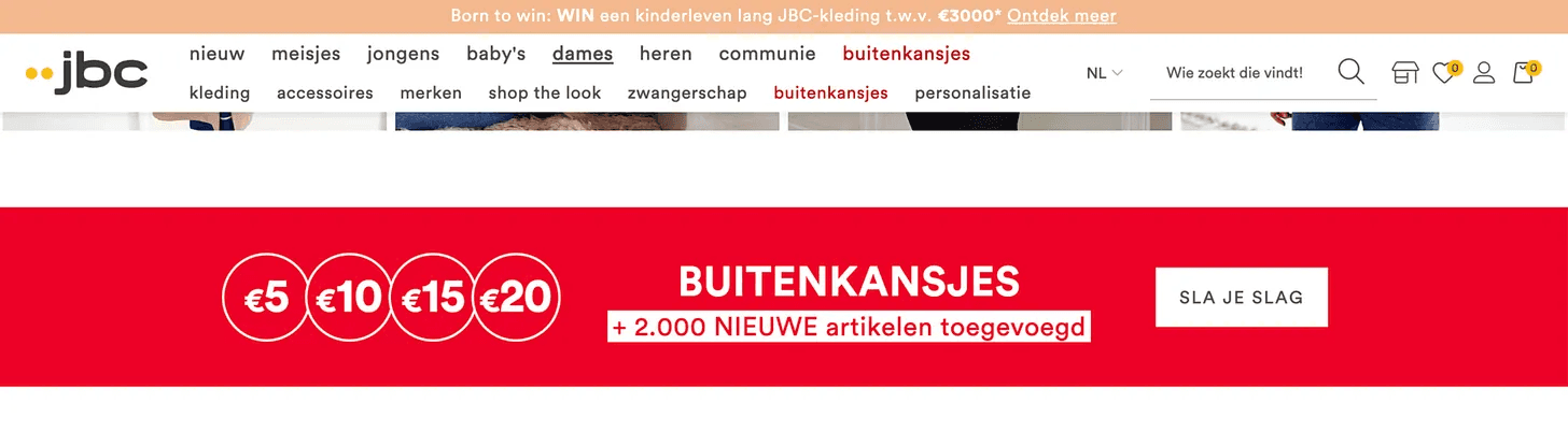 A rather aggressive promotion of “buitenkansjes” with bright red banner on the homepage as well as multiple menu standout links at jbc.com