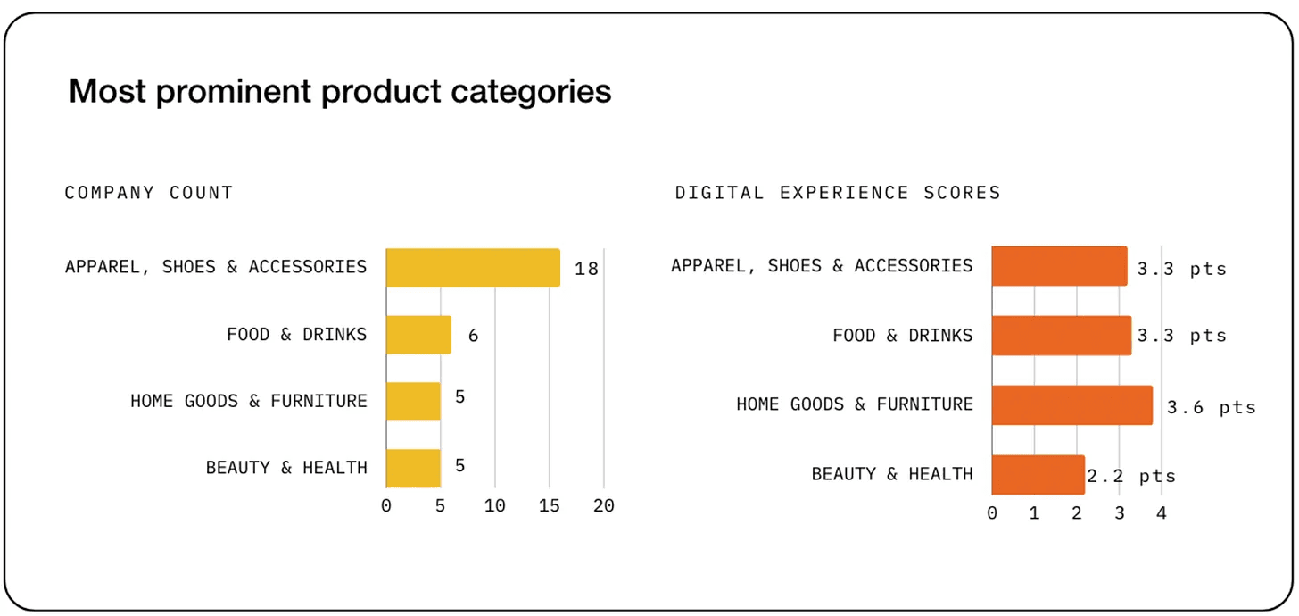In general, consumer brands performed significantly better than fashion retailers. Although both sectors lacked personalisation, sizing advice, and sufficient product information, fashion retailers also struggle with outdated user interfaces and excessive promotional content, which can distract and potentially frustrate users.