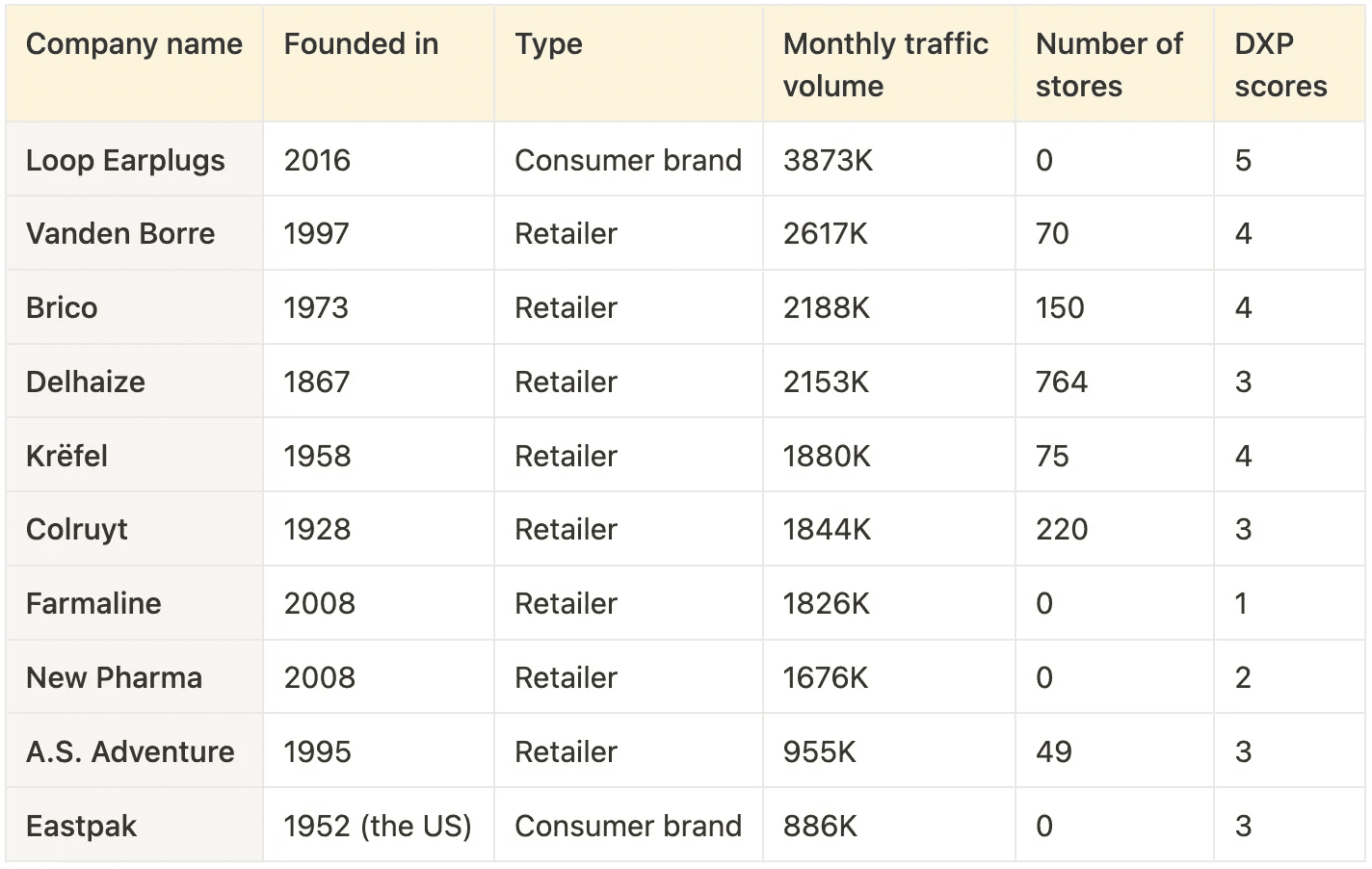 The absolute leader (in terms of both traffic and digital experience score) on the Belgium’s Brand Radar is Loop Earplugs. this brand now generates more traffic than several large Belgian retailers combined. Despite the monthly sales falling from approximately $100,000 to less than $20,000 during the pandemic, Loop Earplugs has experienced a 350% increase year-over-year for the past three years.