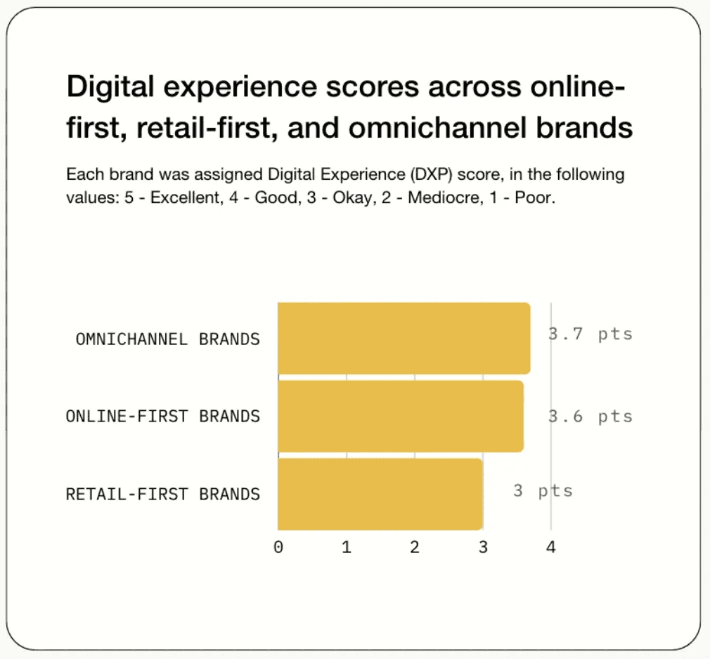 Although omnichannel brands were a minority in the Top 50 list, on average, they had the strongest digital experience scores, while retail-first brands had the weakest.
