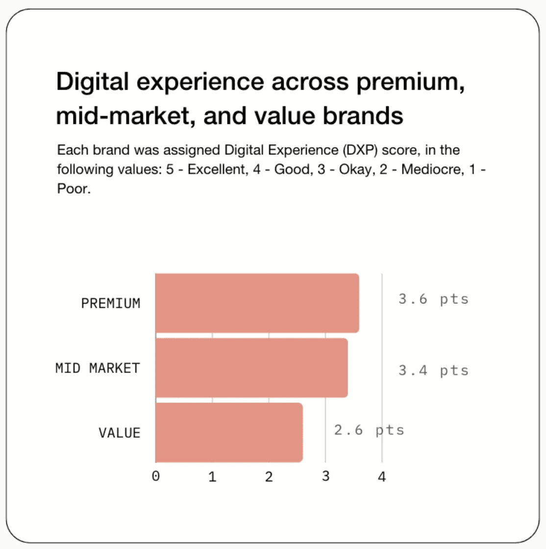 The brand radar is dominated by premium brands. Their Digital experience scores, on average, are 34.6% higher than that of budget brands and 7.4% higher than the average score of mid-range brands.