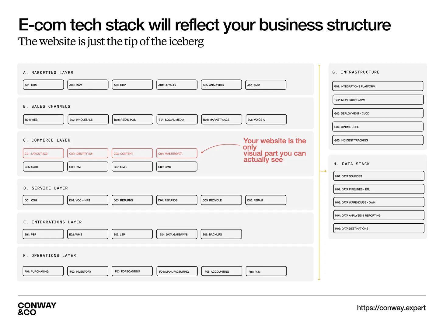 Flash forward to today. Together with a team of senior consultants, we’re helping some of the world’s most respected modern consumer brands get fit for growth. With Conway’s law in mind, we change the internal structures of the company to build the right technology stack. This is a complex process, which is all about creating a new, improved operating model that conquers the complexity of scaling up. This operating model is the “sum of ideas” that determine how people, processes and technology are organised, making it the engine for business growth.