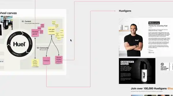 The Miro worksheet includes the analysis of Huel's strategy, tactics, and user experience.
