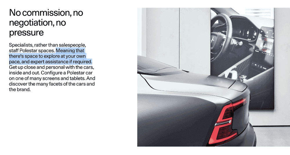 Polestar understood how annoying the sales pressure can often be. The automotive industry is especially notorious for that. Therefore Polestar’s studios are very minimalistic and allow the visitor to discover their vehicles alone, without unnecessary interactions.