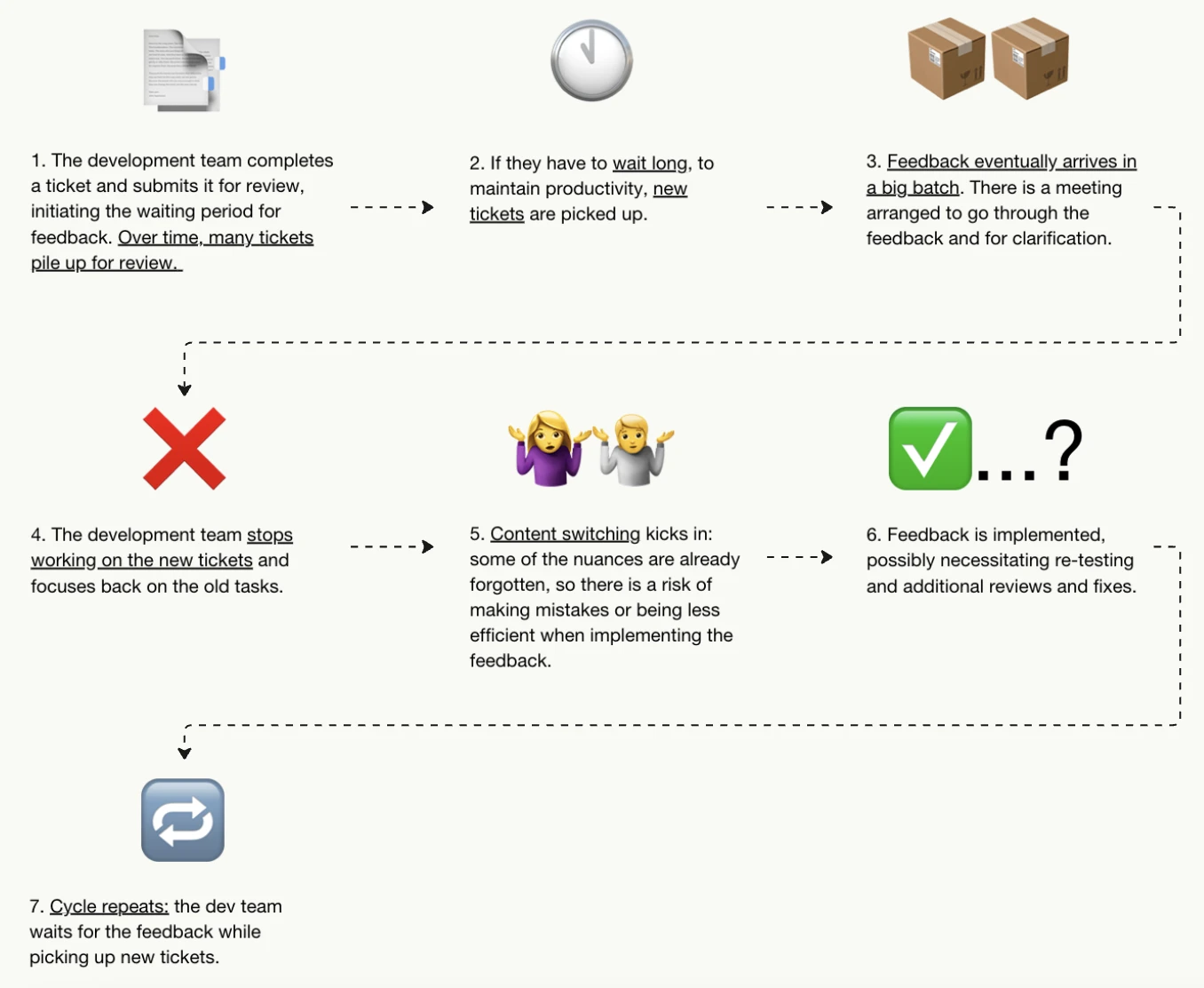 Long feedback loops negatively impact efficiency and quality of output. When feedback stacks up, it extends not only the duration but also the density of review meetings, overwhelming the development team with a deluge of information to process all at once.