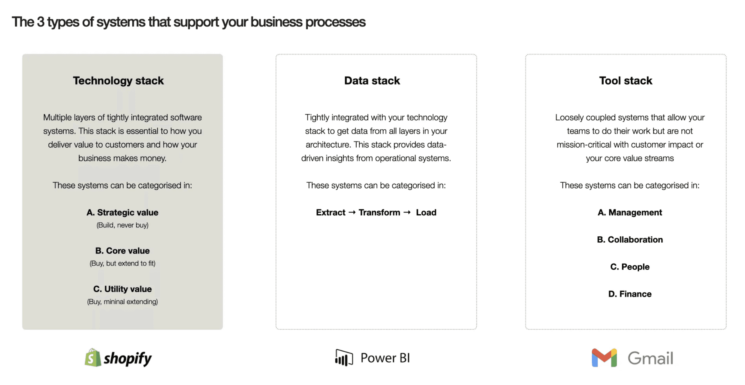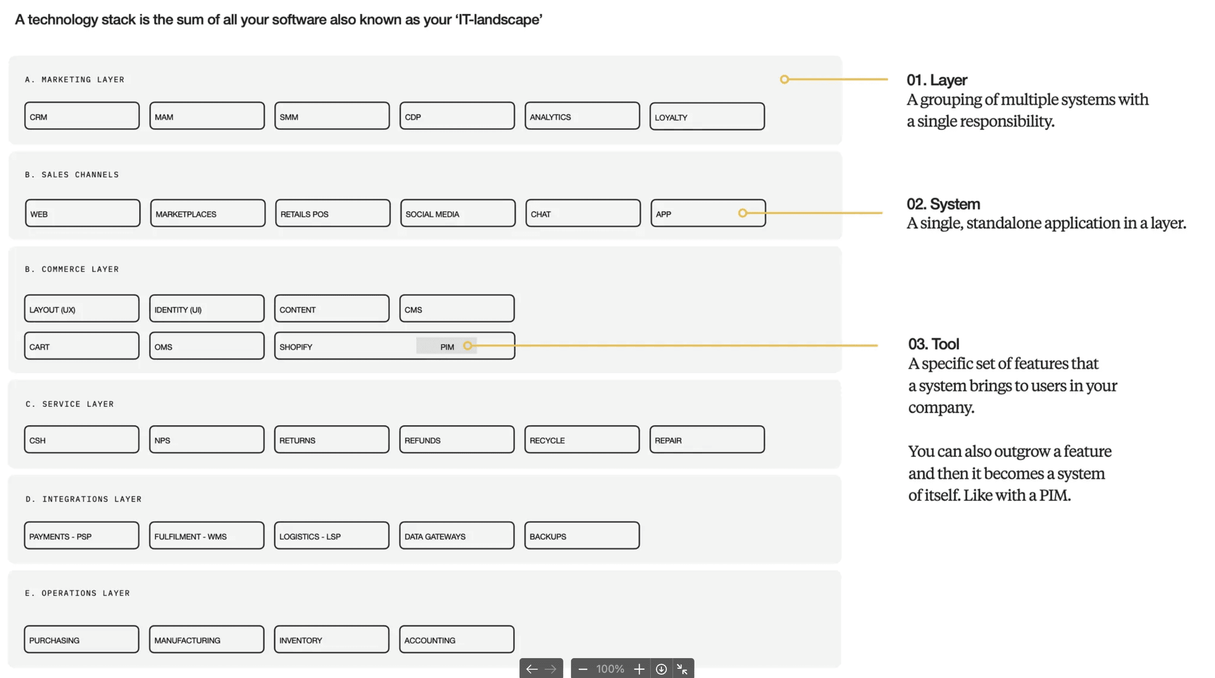 At Conway, we organise the e-com tech stack into layers, systems, and tools. As some companies tend to acquire more than 100 systems throughout growth, keeping everything in structure is crucial.