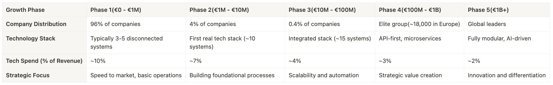 Disclaimer: While these growth stages provide a useful framework, they're just a rule of thumb based on patterns we've observed. Every business is unique, and your optimal technology decisions will depend on various factors beyond revenue size alone. The key is understanding your specific business context before making any technology decisions.