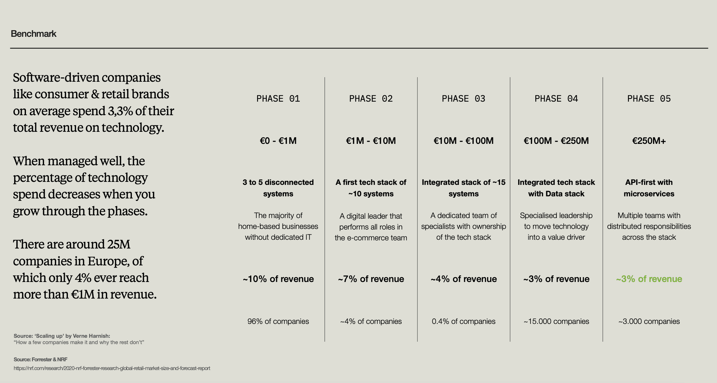 Based on research and our experience helping consumer brands scale beyond €200M, companies typically move through distinct growth phases: