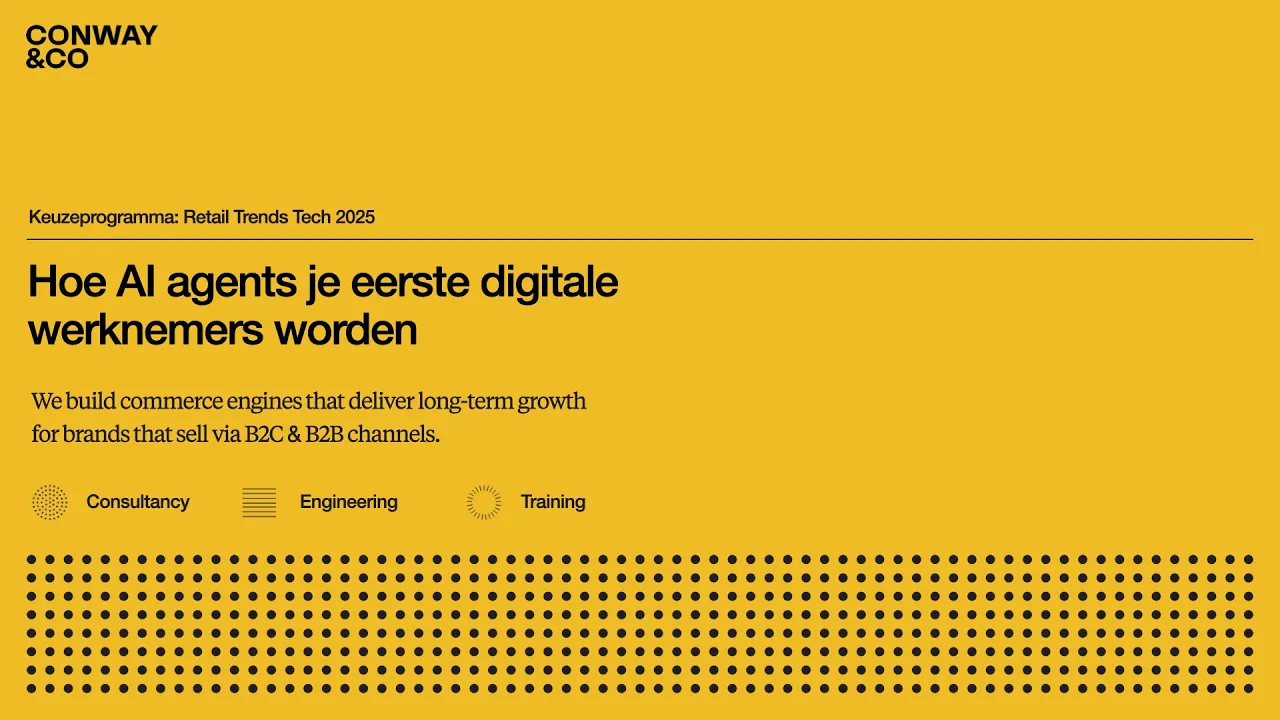 Tijdens onze presentatie introduceerden we het Conway_OS framework: een systematische aanpak die jouw bedrijf opsplitst in zeven componenten die samen je commerce engine vormen. Strategy, Experience, Data, Process, Technology, People en Execution; allemaal met de klant centraal. Voor succesvolle AI-implementatie zijn vier fundamenten uit dit framework cruciaal.
