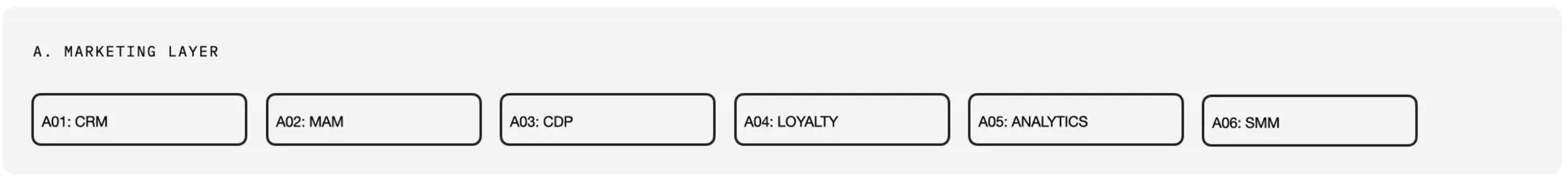 This layer is responsible for attracting and retaining customers through various channels and campaigns. It includes tools that manage customer data, loyalty programs, and marketing automation.