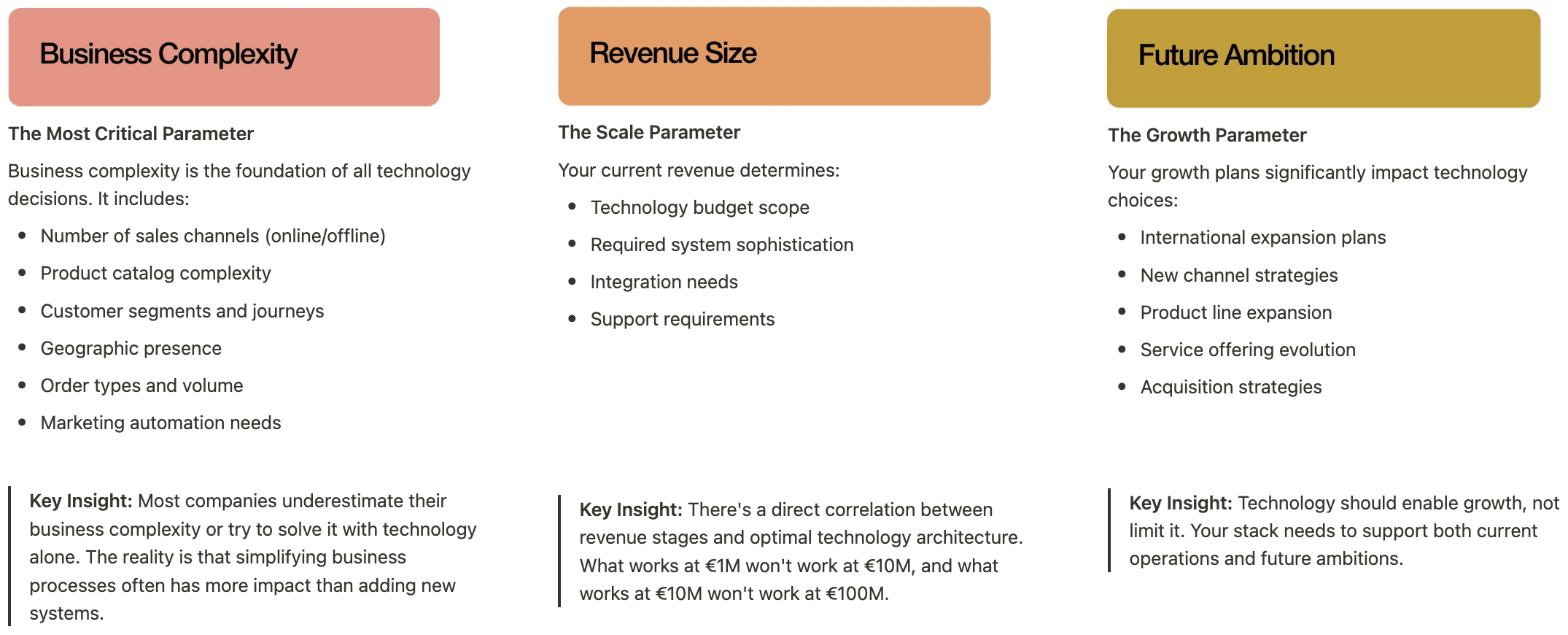 However, our experience helping brands scale beyond €200M shows that successful technology decisions start with understanding your business context first.