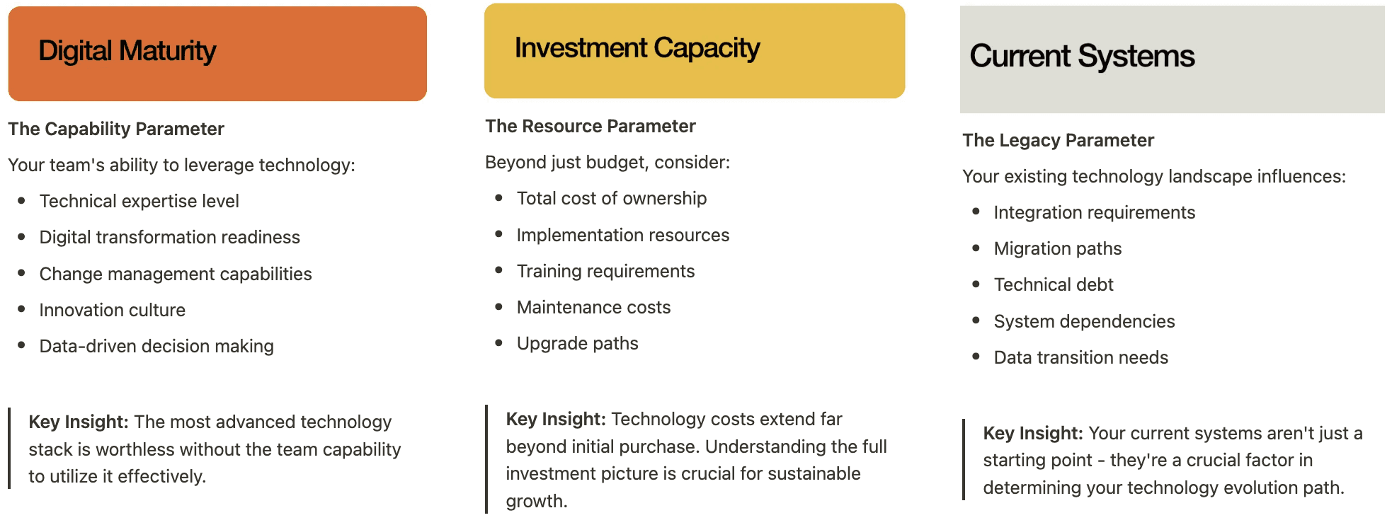 Your technology stack is too important to leave to chance or base on incomplete information. Understanding these six parameters - and how they interact - is crucial for making informed technology decisions that support your growth ambitions.