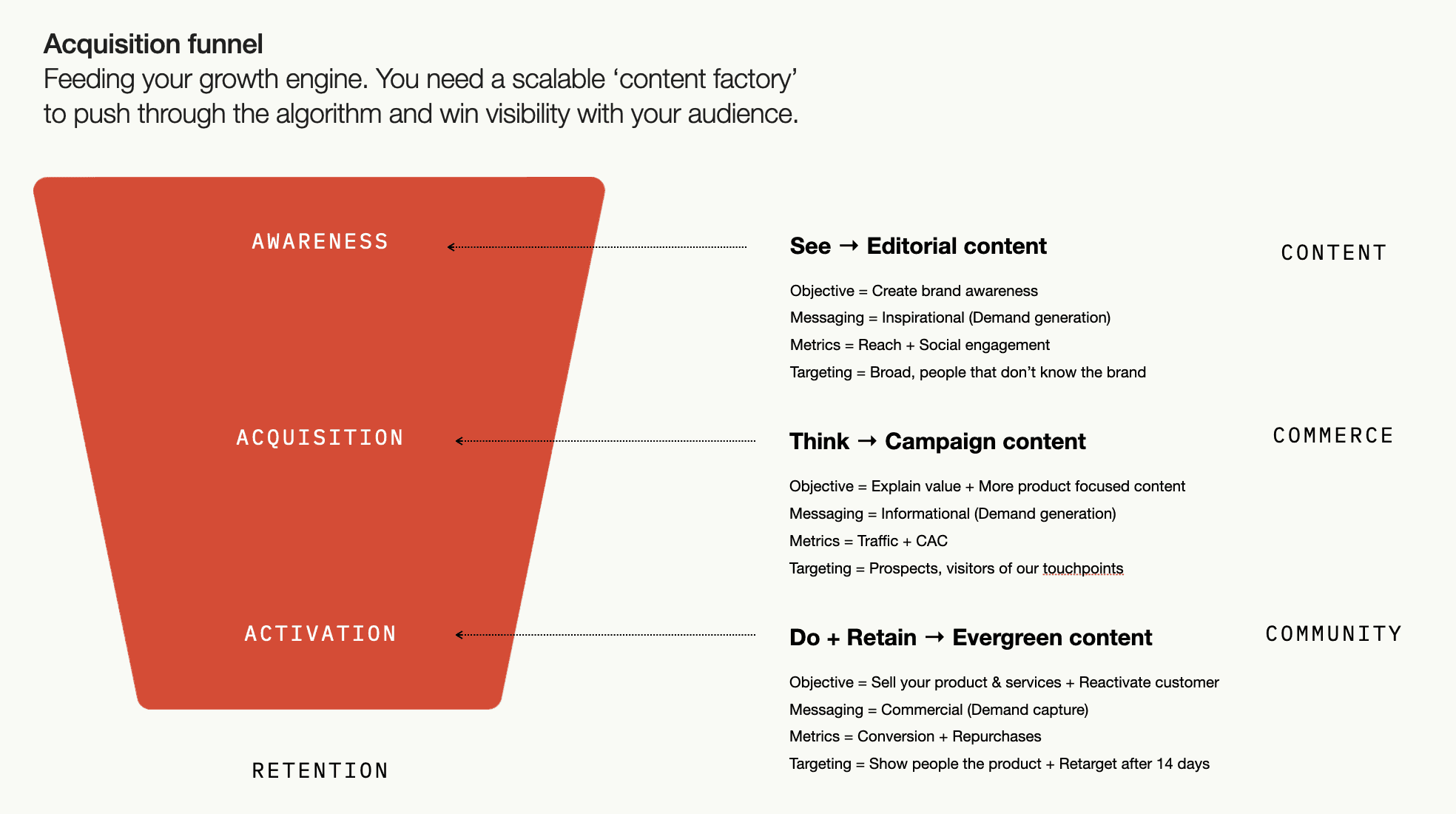 Feeding this acquisition funnel and, by extension, the growth engine requires a significant amount of content, so much so that it's often likened to operating a Content Factory. This demand for content arises from the need to push through the algorithms of various social media feeds, making the brand's presence known and felt. Thus, combining content and paid media becomes the key to achieving visibility with your audience.