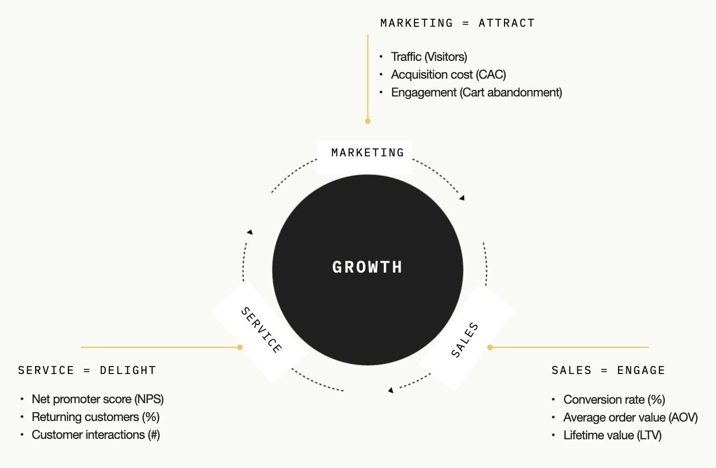 The metrics model of the growth engine focuses on customer centricity: turning strangers into your brand promoters. Essentially there are three areas where performance matters most in achieving that: marketing, sales, and service. Measure these metrics and their performance will guide you in identifying challenges, opportunities, and will guide your efforts.