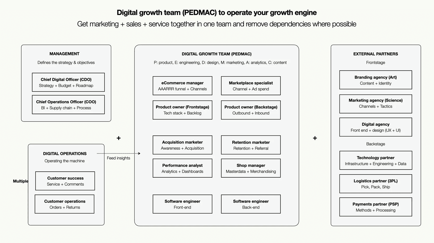 From our experience, a balanced team would ideally blend product, engineering, design, marketing, analytics, and content expertise—often referred to as the "PEDMAC" setup. The challenge lies in ensuring that these specialised roles still operate in synergy, even if spread across different departments.