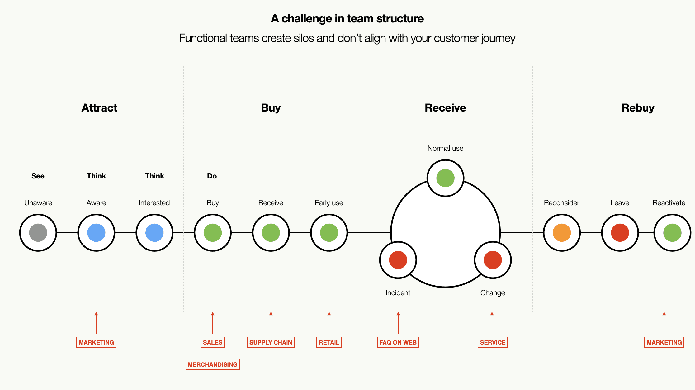 While this division can help specialise roles, it often diminishes the agility that smaller teams possess. There's an increased risk of various aspects of the customer journey falling under isolated teams. Siloed departments can lose sight of the overarching customer journey, which should be the central focus.