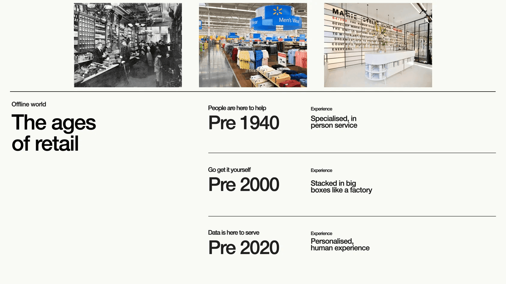 The history of retail demonstrates how the shopping experience has dramatically changed over the years: from personalized shopping experiences in the early 20th century to the big box retailers offering vast product variety at lower prices at the end of the millennium.