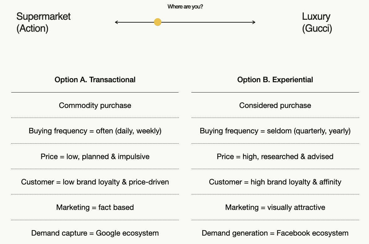 These two brand categories align differently with omnichannel experiences. Value brands thrive in straightforward transactional settings (think of the "Action" supermarket), whereas luxury brands, need immersive, boutique-like, personalized interactions. When designing your omnichannel strategy, take into account your brand's positioning and find a balance between the transactional and experiential benefits of each channel and tactics for them.