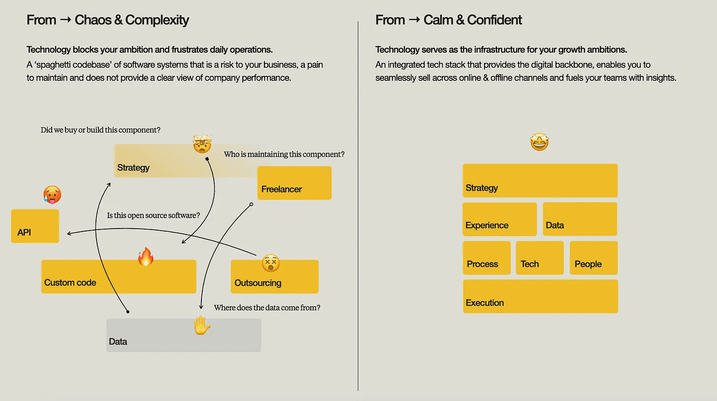 Because each new market, channel, or product adds complexity your systems must handle. Without deliberate architecture, temporary fixes become permanent and reactive additions create a fragile ecosystem, which blocks digital growth. For example, you simply cannot launch that new market on time because your tech stack won’t support proper localization or sync the data.