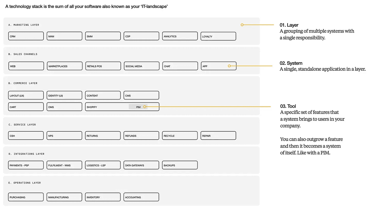 Your technology stack can be divided into layers. Each layer is a collection of tech systems that support a specific aspect of a customer journey.
